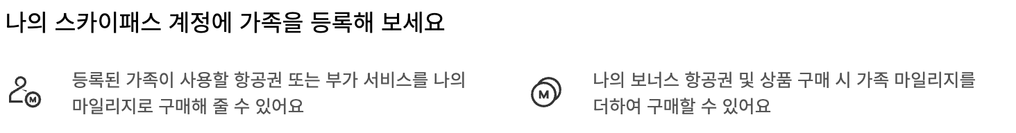 가족 등록 대상은 스카이패스 회원에 한하며, 가족 등록과 동시에 가족 마일리지 합산 사용이 가능합니다. 혼자 적립하여 사용하는 것보다 빠르게 필요한 마일리지를 모아 항공권 구매 및 좌석 업그레이드에 사용이 가능합니다. 이번 포스팅에서는 가족등록이 가능한 범위부터 증빙서류, 신청방법, 등록 완료 확인방법, 마일리지 합산방법에 대해 정리되어있습니다.