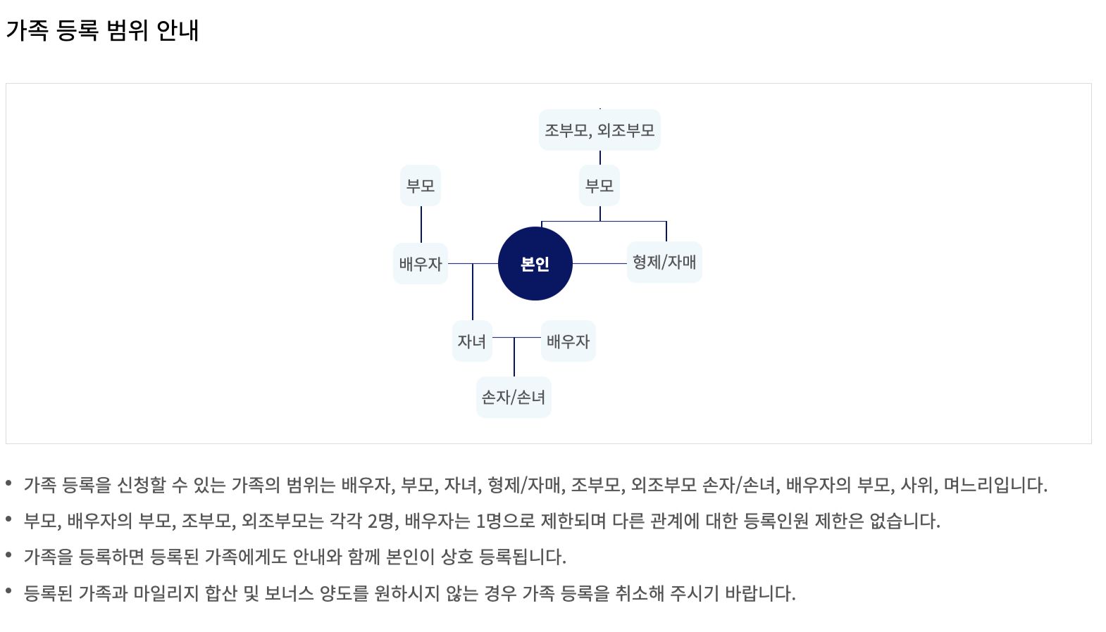 등록된 가족이 사용할 항공권 또는 부가 서비스를 나의 마일리지로 구매 할 수 있으며 보너스 항공권 및 상품 구매 시 가족 마일리지를 더하여 구매하실 수 있습니다.