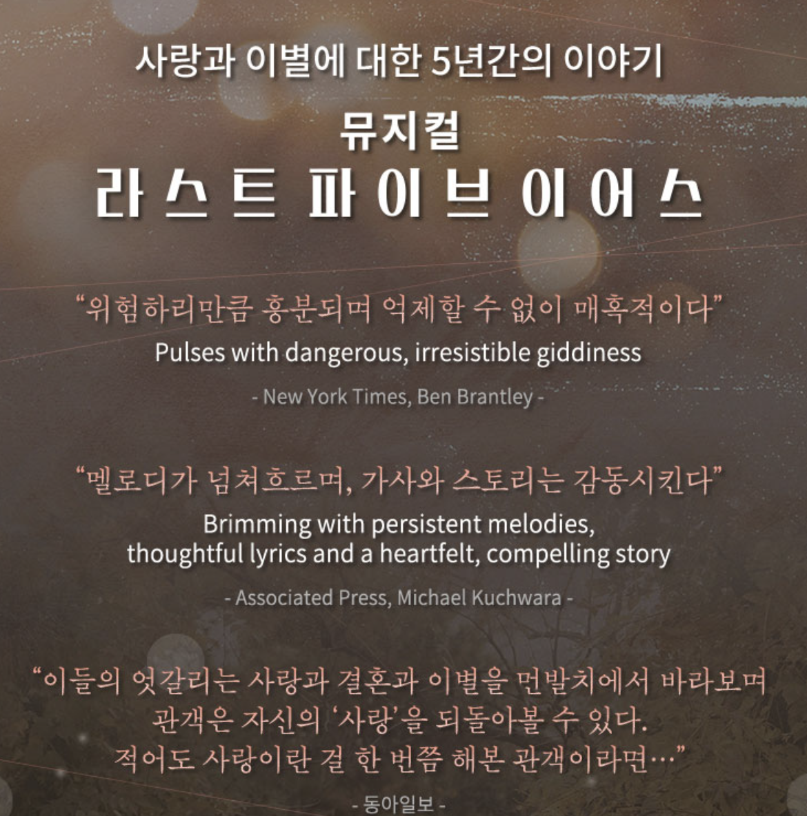 뮤지컬 라스트 파이브 이어스는 2002년 오프브로드웨이서 올라 Drama Desk Award애 7개 부문 노미네이트 되고, 작곡상과 작사상을 수상하였으며 한국에서는 2003년,2008년 두번 공연이 되었습니다. 뮤지컬 간략한 줄거리와 곡 리스트, 캐스팅 그리고 공연 기본정보를 정리해두었습니다. 곡 리스트 옆에 음악을 미리 감상해 보실수 있는 링크 걸어두었으니 공연 예습후 더 이해도 높은 관람 하시길 바랍니다.