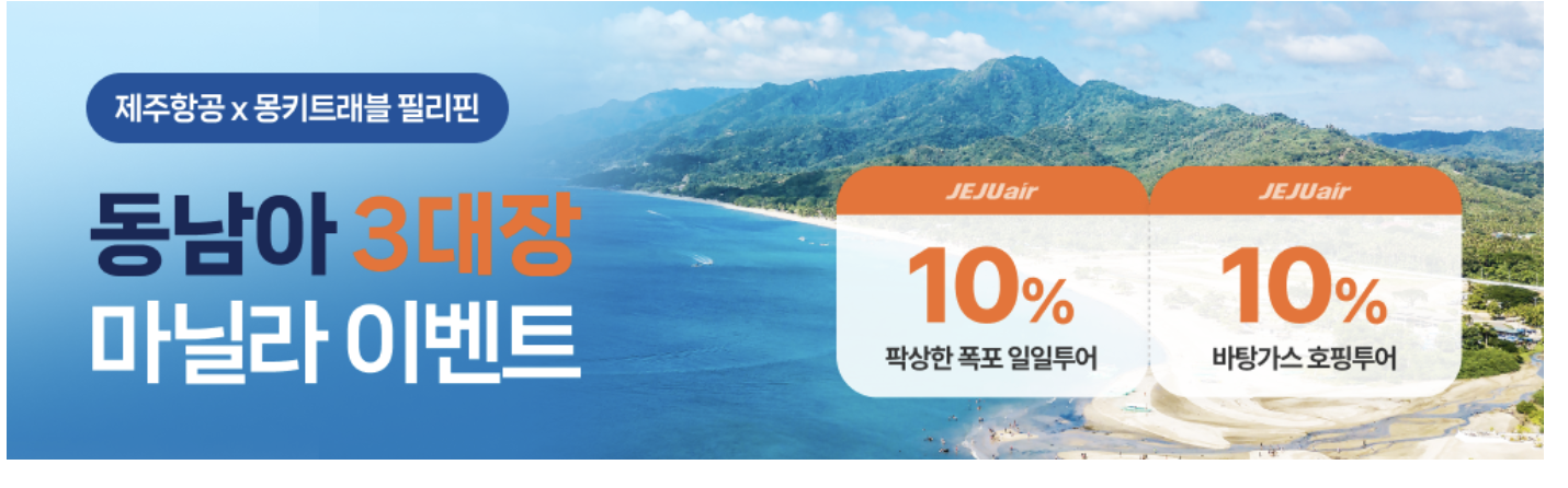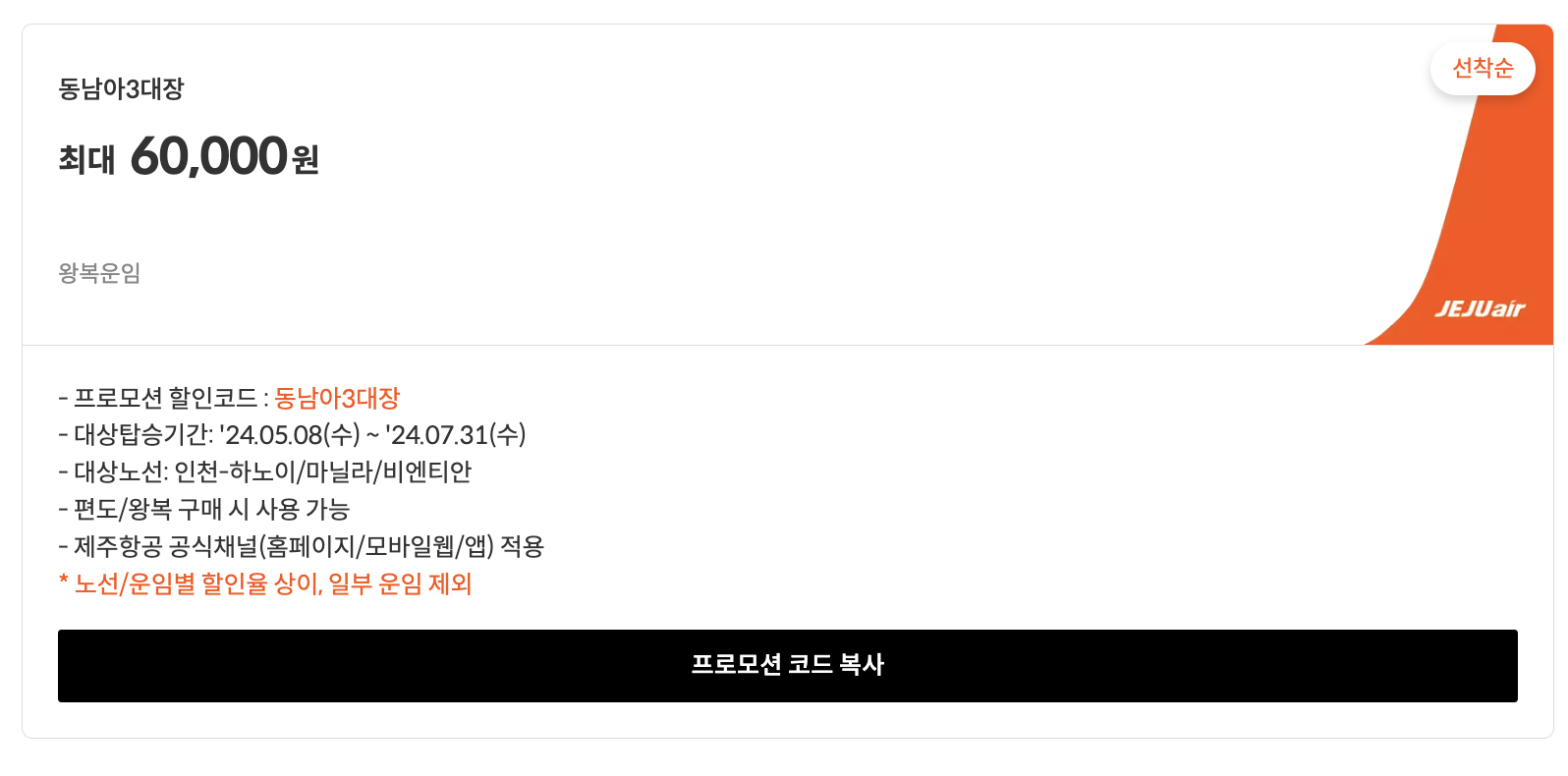 현재 제주항공 공식 홈페이지, 모바일에서 항공권 구매시 할인코드를 넣으면 운임할인 받아 저렴한 여행을 다녀올 수 있는 프로모션을 진행중에 있습니다. 곧 다가오는 여름휴가 기간 할인코드 받아 저렴한 가격에 다양한 액티비티와 휴양을 즐길수 있는 동남아 여행 계획세우시는 분들 선착순으로 진행되는 프로모션이니 할인코드 입력하시고 서두른 예매 진행하시길 바랍니다.