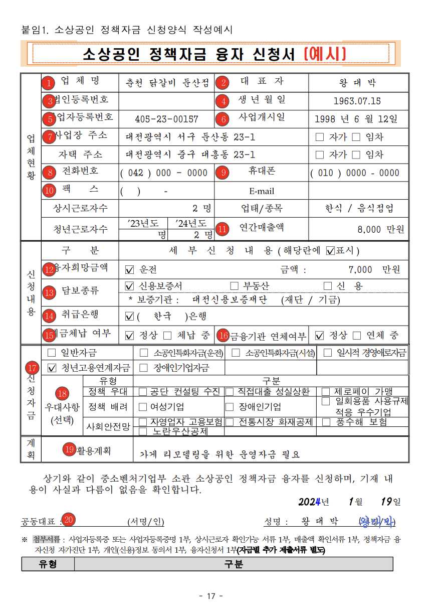소상공인 정책 자금 신청양식 작성예시