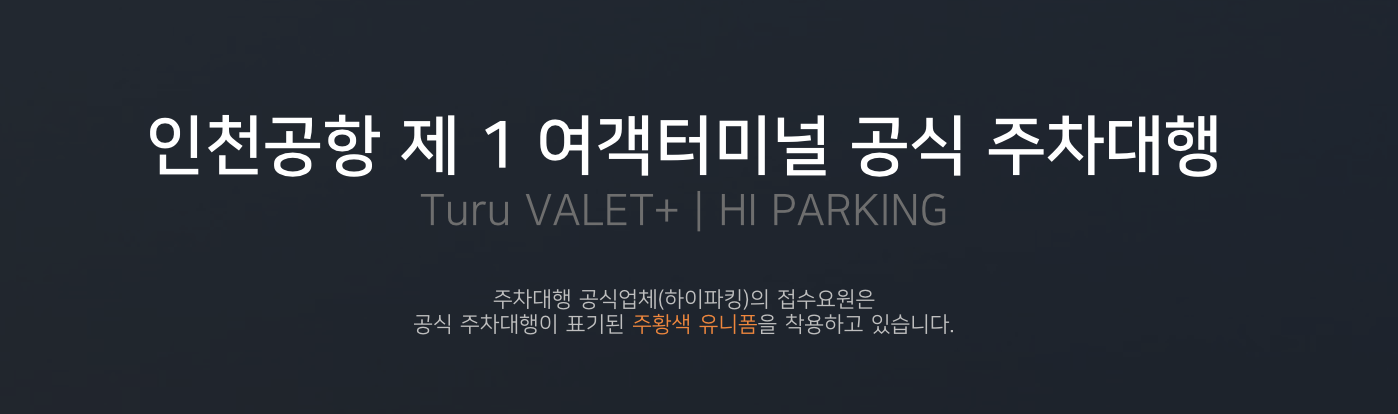 비행출발 시간이 촉박하거나 짐이 많아 직접 주차하기 번거로울 때는 인천공항 공식 주차대행(발렛파킹) 서비스를 이용할 수 있습니다. 주차대행 서비스는 24시간 연중무휴 운영되고 있으며, 주차대행 서비스 요금과 주차료는 후불 정산됩니다.