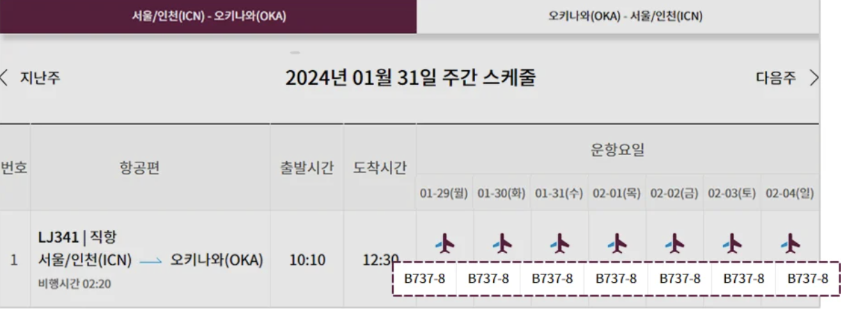 진에어 홈페이지 접속 후 스케줄 조회 탭으로 들어가 줍니다. 출발지, 도착지 그리고 날짜까지 입력하신 후 스케줄 조회를 해줍니다. 운항 요일에 따라 위 첨부 사진과 같이 비행기 이미지 아래 항공편 기종 확인을 해줍니다.