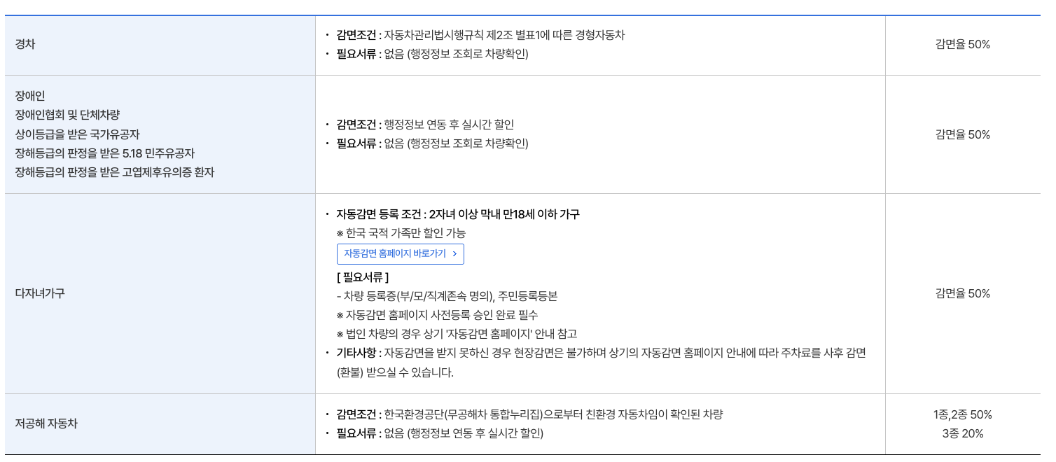 경차 이용하시는 분들, 다자녀가구 등 요금감면 가능합니다.