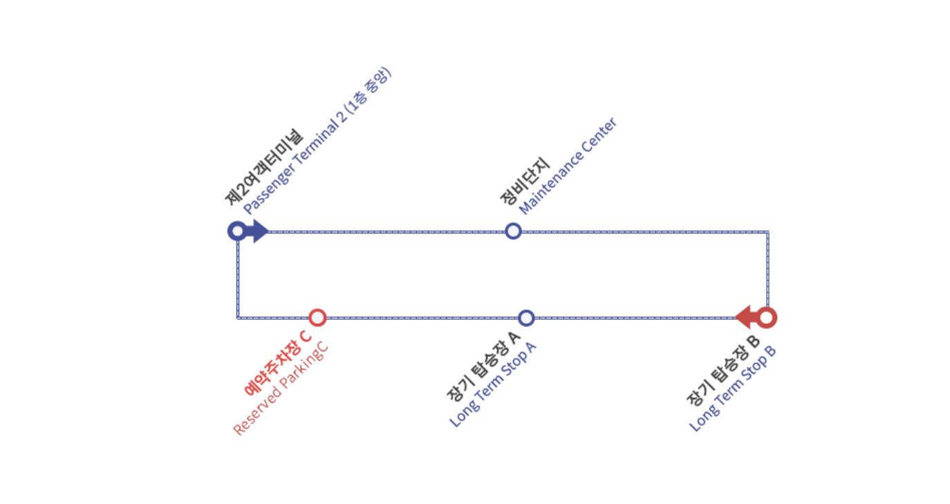 장기주차장 같은 경우 주차장과 여객터미널까지 거리가 있어 셔틀버스를 통해 이동하셔야 합니다. 여객터미널간 순환버스는 5~16분 간격으로 운영되고 있으며 소요시간은 약 15분 소요됩니다.