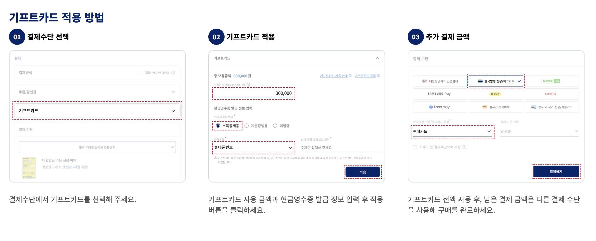 대한항공에서 제공되는 기프트 카드는 항공권, 초과 수하물 및 유료 좌석 구매시 이용이 가능합니다. 사용은 대한항공 홈페이지 또는 모바일 앱을 이용하여 사용하셔야 하며, 결제시 결제 수단으로 신용카드 등 다른 결제 수단과 동시 사용이 가능합니다. 사용범위는 한국출발 국제선 및 국내선 항공권 구매, 초과 수하물, 유료좌석, 반려동물 동반서비스, 보너스 항공권의 세금 및 유류할증료, 캐시 앤 마일즈 결제금액 사용이 가능합니다.