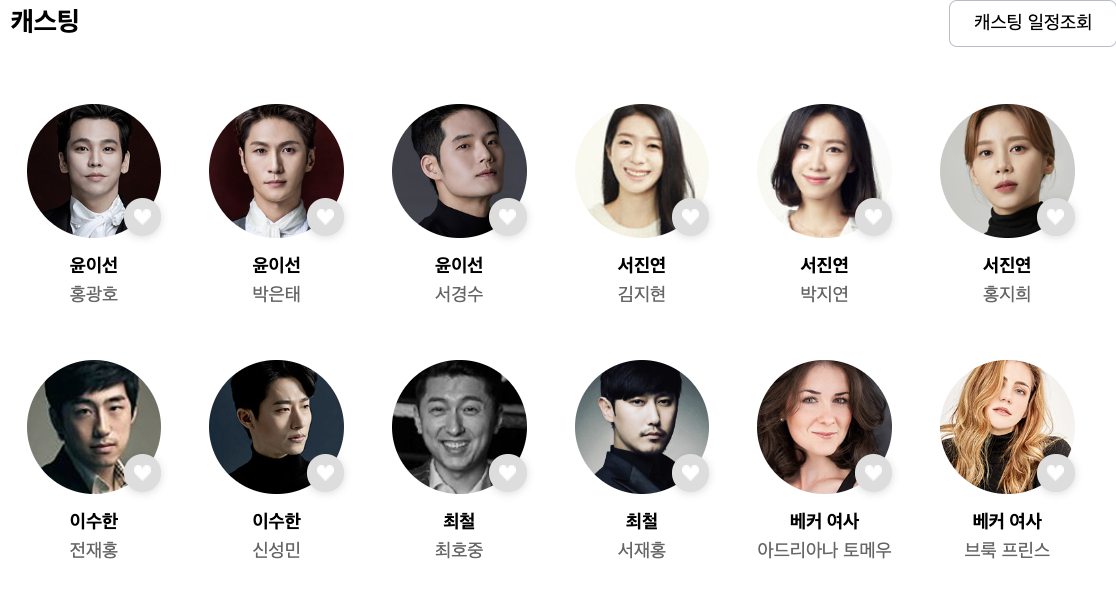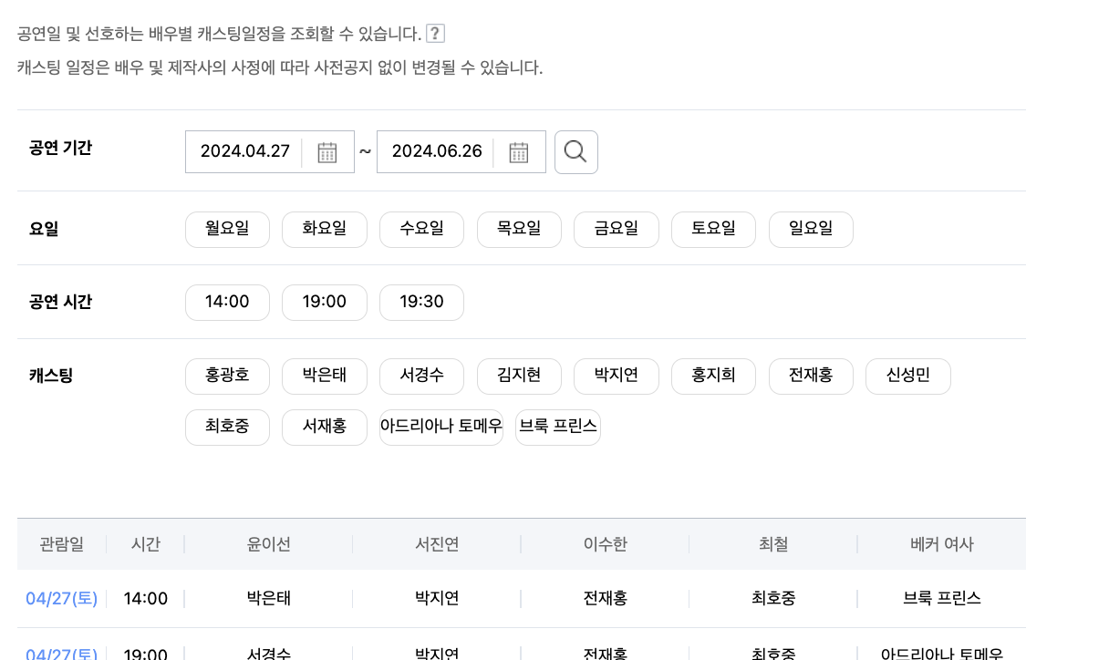 날짜와 회차별로 뮤지컬 배우가 다릅니다. 배우가 다른 만큼 같은 공연이지만 배우에 따라 다른 느낌의 뮤지컬 관람이 가능하십니다. 아래 링크로 들어가시면 공연일 또는 선호하는 배우별 캐스팅 일정을 쉽게 조회할 수 있습니다.