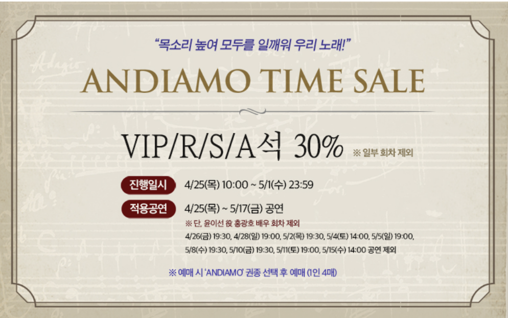 3매 | 3매, 4매 단위 예매 시 할인 적용 공연 : 4/16(화)~ 4/28(일) 공연 4월1(월)부터 예매 시 적용 할인 적용 공연 : 4/30(화)~5/19(일) 공연 4/22(월)부터 예매 시 적용 -동일 회차, 동일 등급으로 예매 시 적용 -부분 취소 불가 |