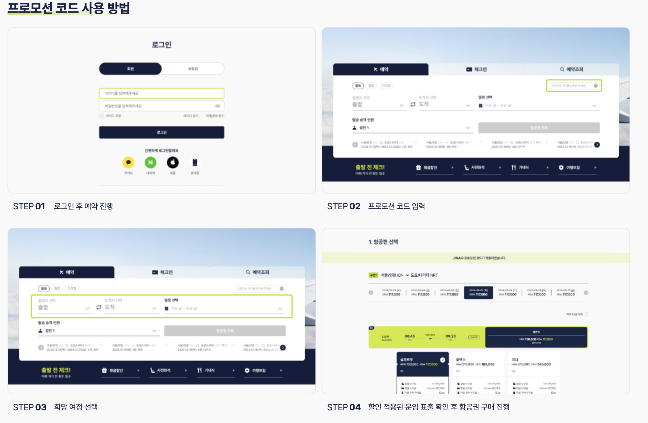프로모션은 진에어 홈페이지 회원가입후 로그인을 하셔야 이용 가능합니다. 여정 조회시 사용 가능한 '프로모션 코드'를 입력후 적용하여 여정 일정 조회하시고 할인 적용된 운임 확인후 구매 진행하시면 됩니다.