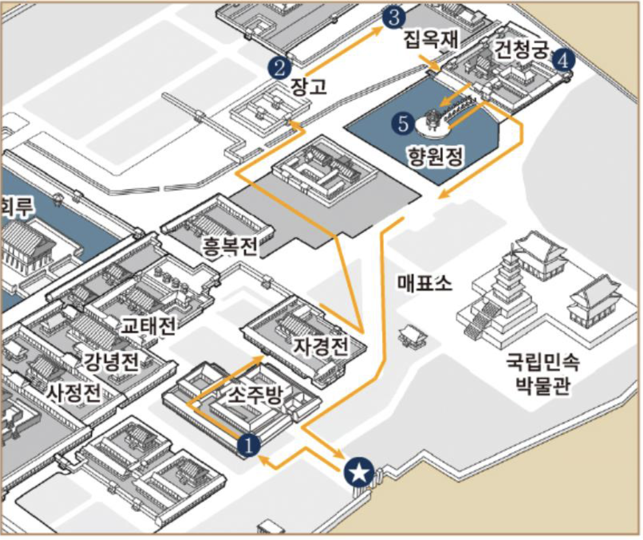 ①국립민속박물관 앞(집결) → ②외소주방(궁중음식 체험 및 국악공연 관람) → ③장고→ ④집옥재·팔우정 → ⑤건청궁 → ⑥향원정
