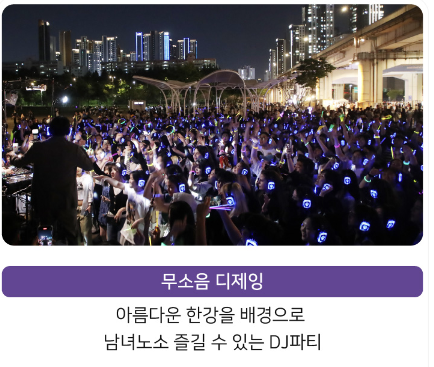 사일런스디스코로도 유명한 무소음파티는 현재 5~6월 티켓이 오픈되어 있습니다. 무선헤드폰을 쓰고 디제잉 음악을 듣는 파티로 온라인으로 예약이 가능합니다. 현장에서 200대 한정으로 현장접수를 받고 있기는 하지만 빠른 소진으로 파티를 즐기시고 싶으신 분들은 반드시 예약 진행후 방문하시는걸 추천드립니다.
