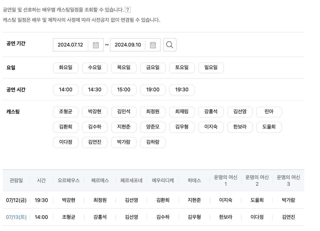 공연 날짜별 캐스팅 정보