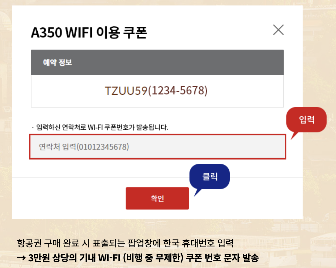 항공권 구매 완료시 표출되는 팝업창에 핸드폰 번호를 입력하시면 쿠폰 번호가 문자 발송됩니다. 여행중 기내에서 와이파이 연결시 네트워크 OZ_WIFI를 먼저 연결해주신뒤 요금제 선택창에서 문자로 받으신 이용권 번호를 입력하면 무제한 무료 사용이 가능합니다.