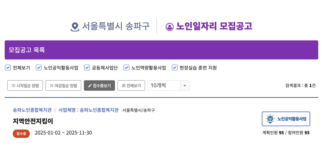 2025년 서울 송파구 노인일자리(공익·시장·공동체 사업) 모집 인원, 신청조건, 일정, 신청방법(방문·온라인)까지 한 번에 정리했습니다. 송파구 60·65세 이상 어르신 필독!