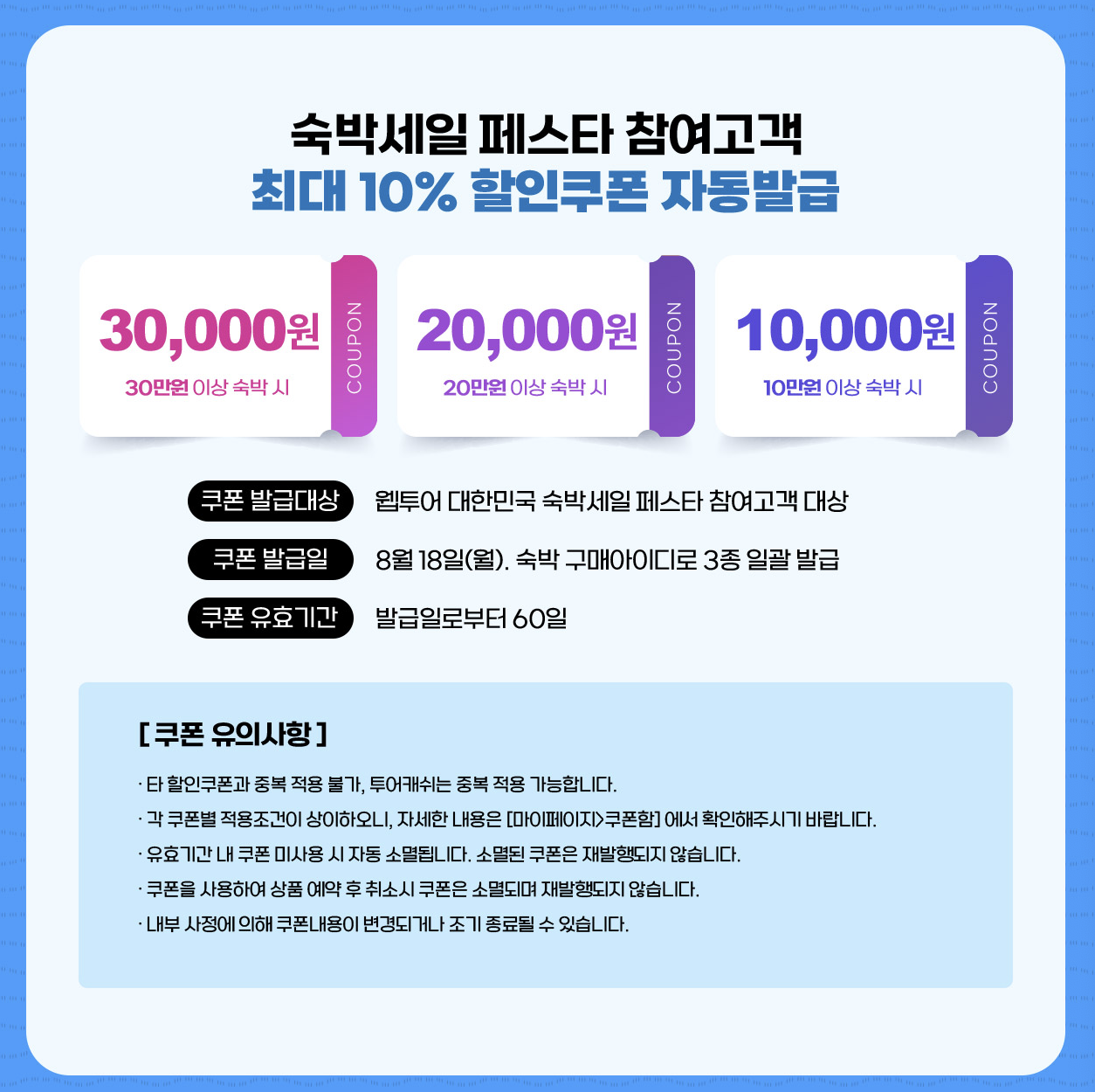 또한 숙박세일페스타를 웹투어로 이용하시면 바로 구매아이디로 3종 쿠폰이 발급됩니다. 이는 발급일로부터 60일 사용 가능합니다.
