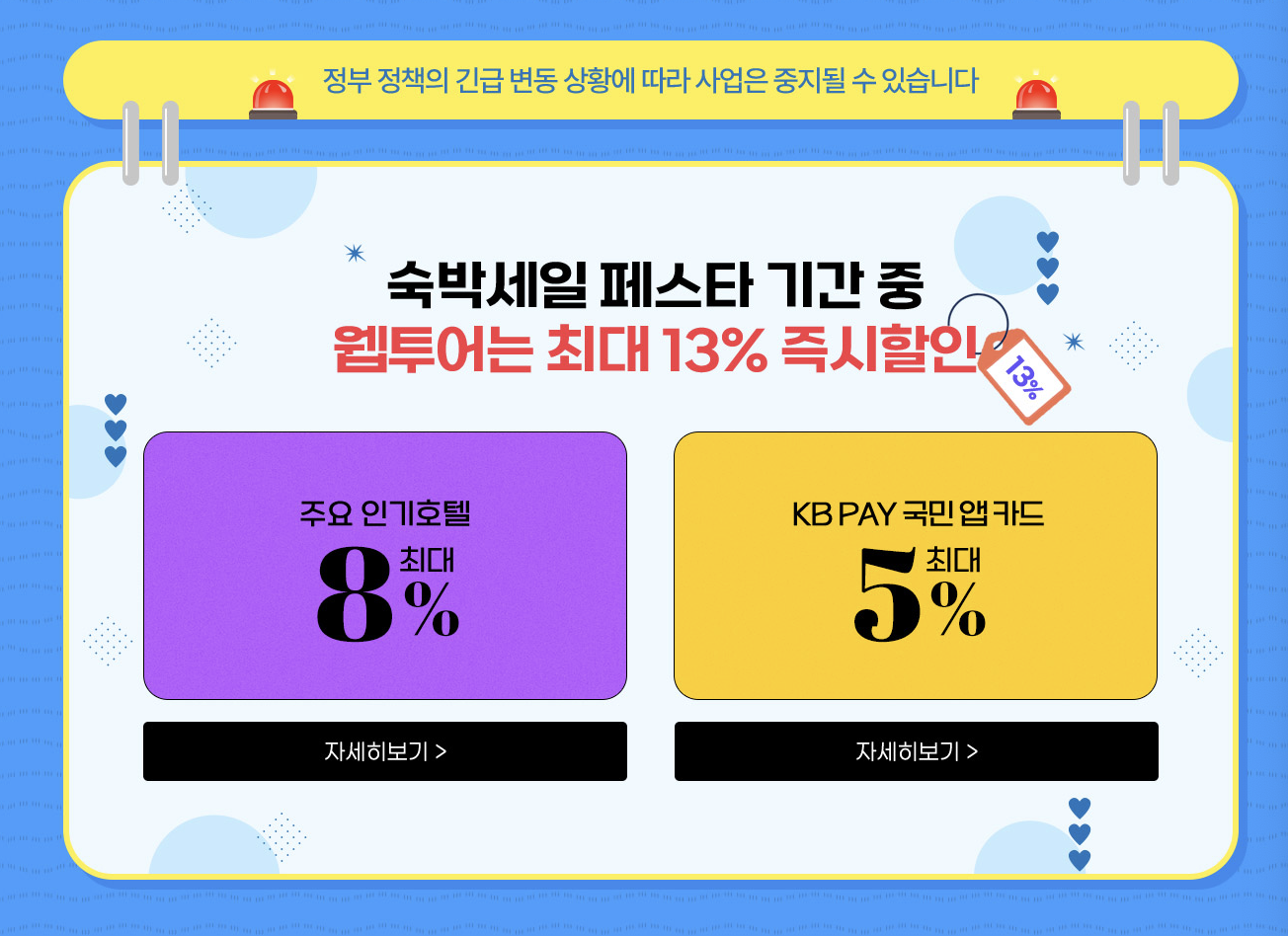 웹투어에서 정리된 주요 인기호텔리스트 예약후 국민 앱 카드 이용하여 결제시 최대 13% 즉시 할인이 가능합니다.