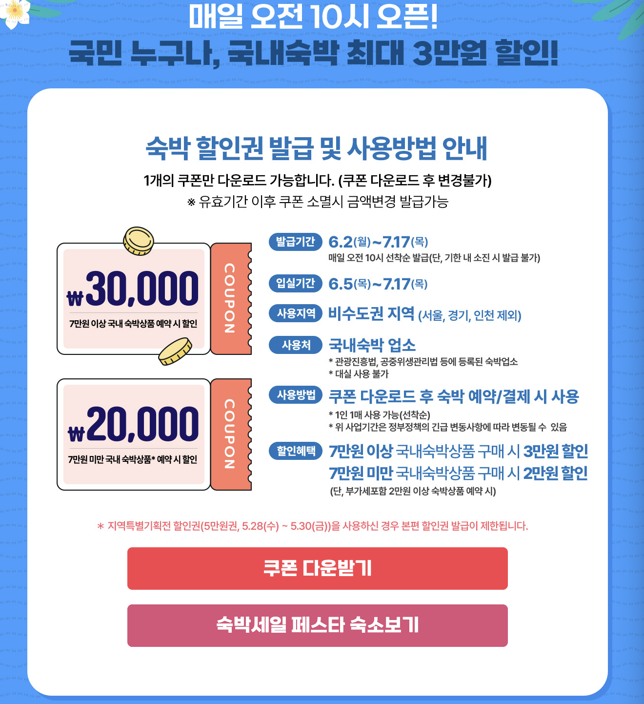 복잡한 절차 없이 아래 링크에서 2025년 6월 숙박세일페스타 쿠폰을 지금 바로 다운받아 사용 가능합니다. 매일 오전10시 선착순으로 쿠폰 발행을 하니 서두르세요!