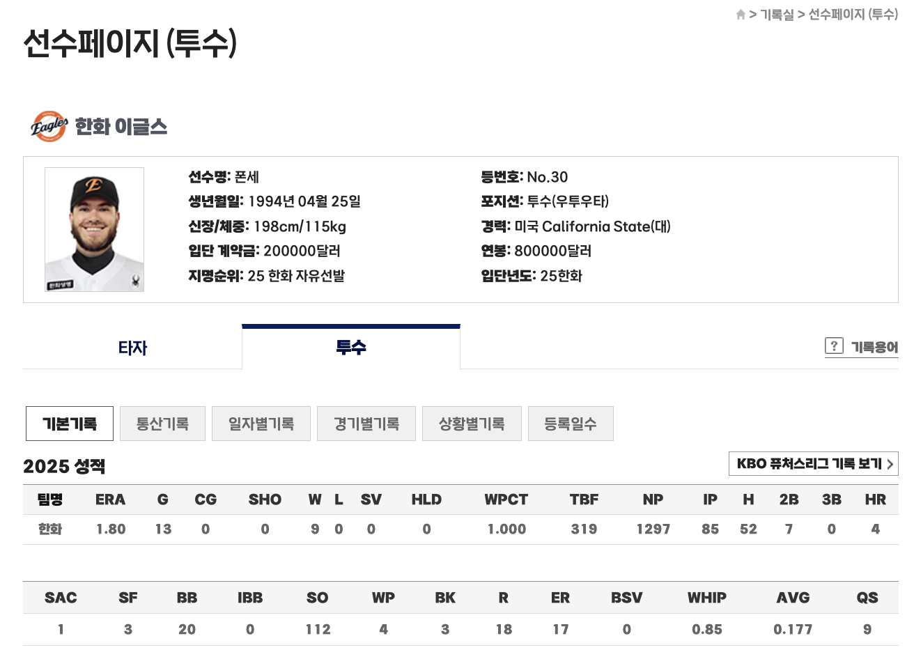 코디 폰세는 2025년 시즌에서 9승 무패, 평균자책점 1.80, 85이닝 112탈삼진, WHIP 0.85, 피안타율 0.1777등의 뛰어난 성적을 기록하며 다승, 평균자책점, 탈삼진 등 주요 투수 지표에서 리그 1위를 달성하고 있습니다.