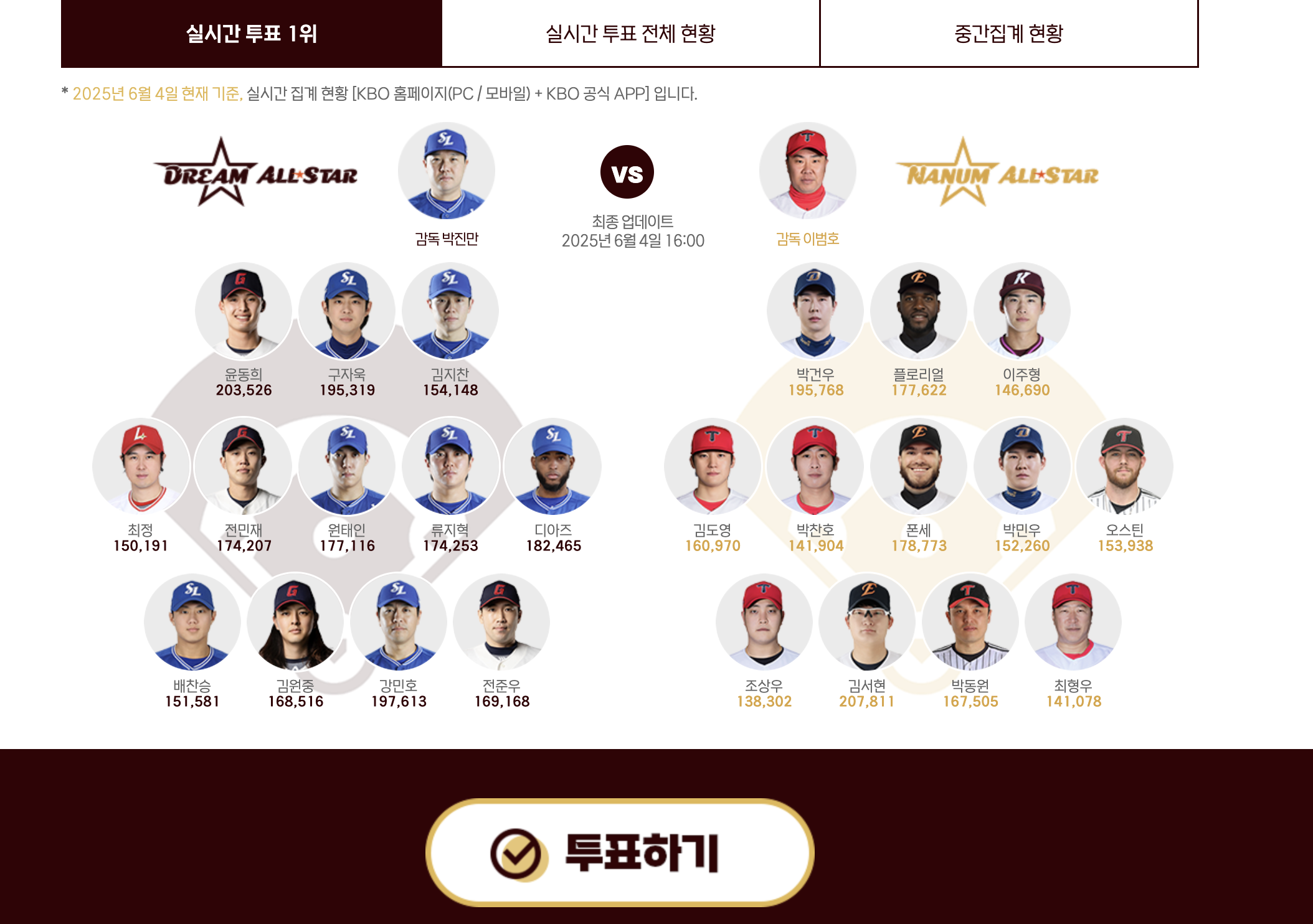 투표는 6월 2일(월) 오전 10시부터 6월 22일(일) 오후 2시까지 총 21일간 실시됩니다. KBO는 3개의 투표 페이지 총 합계 투표수를 취합해 6월 9일(월)과 16일(월) 두차례의 중간집계 결과를 발표할 예정이며 6월 23일(월) 최종 집계 결과를 발표할 예정입니다