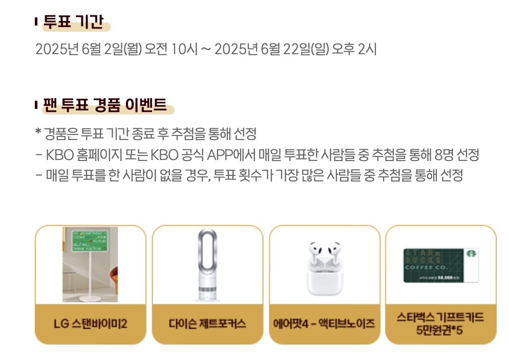 팬 투표에 참여하면 LG 스탠바이미2, 다이슨 핫앤쿨 제트포커스, 에어팟4 액티브 노이즈, 스타벅스 이용권 경품 5종이 준비되어 있으니, 좋아하는 스타를 응원하고 경품의 주인공이 될 1석2조의 기회를 받아보세요 :)