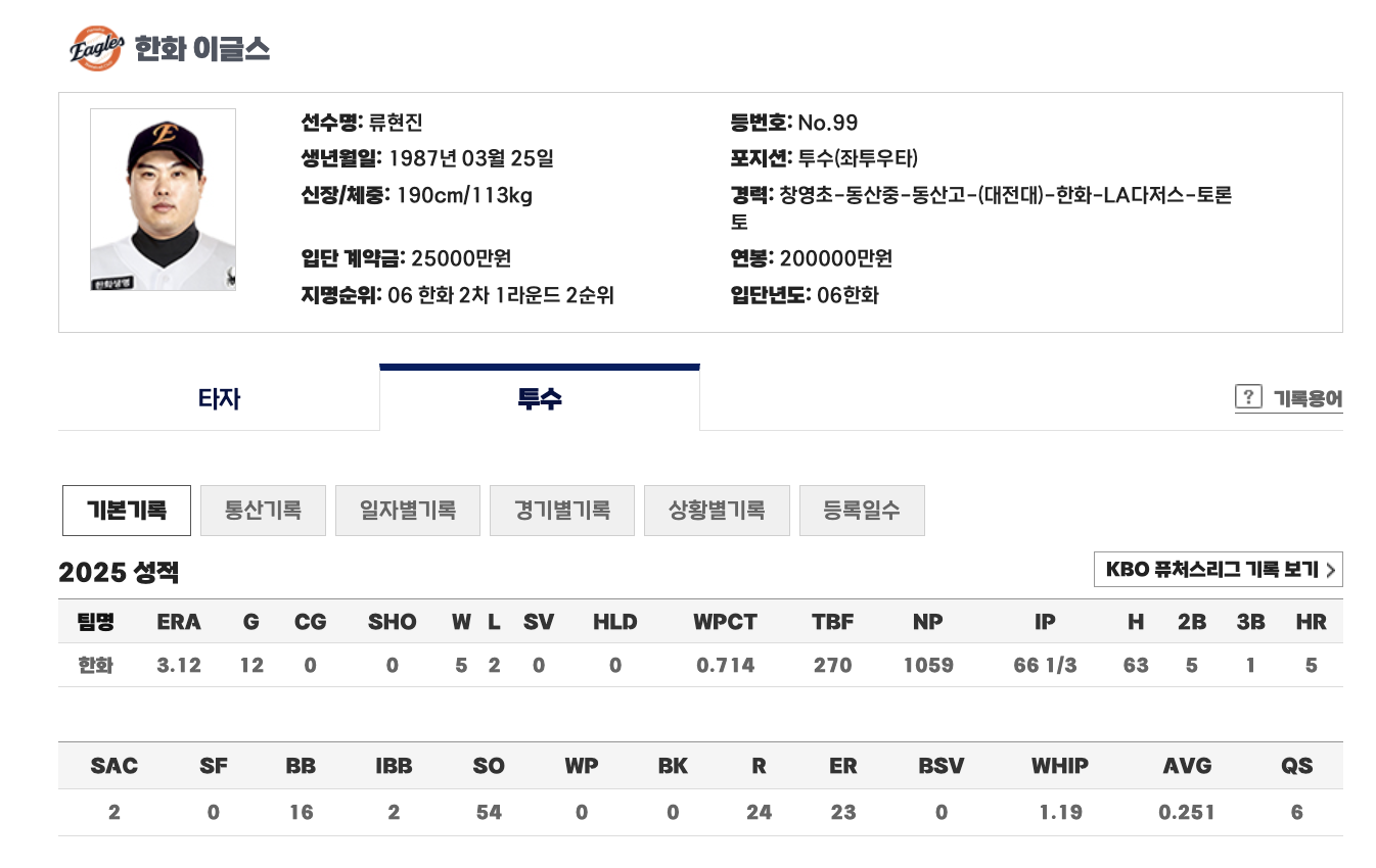류현진은 2025년 시즌에서 5승2패, 평균자책점 3.12의 성적을 기록하고 있으며, 안정적인 투구를 이어가고 있지만, 폰세의 압도적인 성적과 비교하여 후보 선정에서 제외되었습니다.