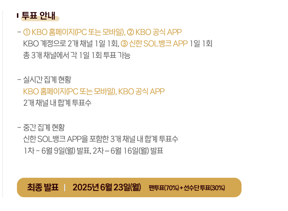 6월 중 진행 예정인 선수단 투표에는 30%의 비중을 부여하고, 팬 투표 70%와 합산해 최종 집계됩니다.