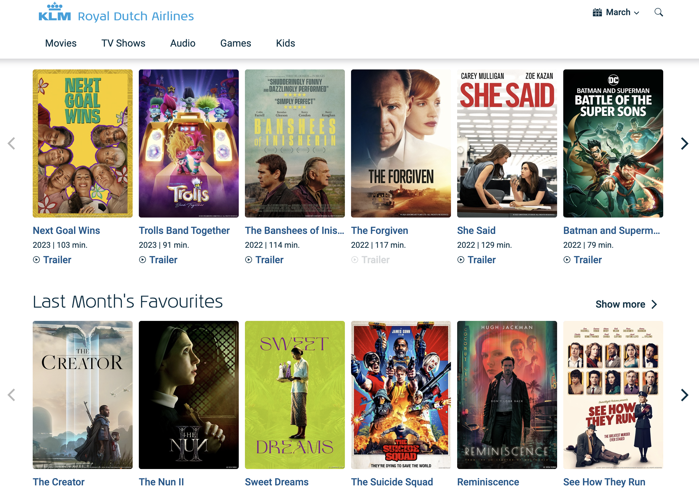 KLM 네덜란드 항공 기내 좌석에는 16-18인치의 스크린이 준비되어있습니다. 모니터를 통해 항공사에서 제공하는 기내 무료 엔터테이먼트 콘텐츠를 즐기실 수 있습니다. 영화, TV채널, 음악 그리고 아동 승객을 위한 유아채널을 보유하고 있으며 아래 링크로 들어가시면 리스트를 미리 확인하실수 있습니다.