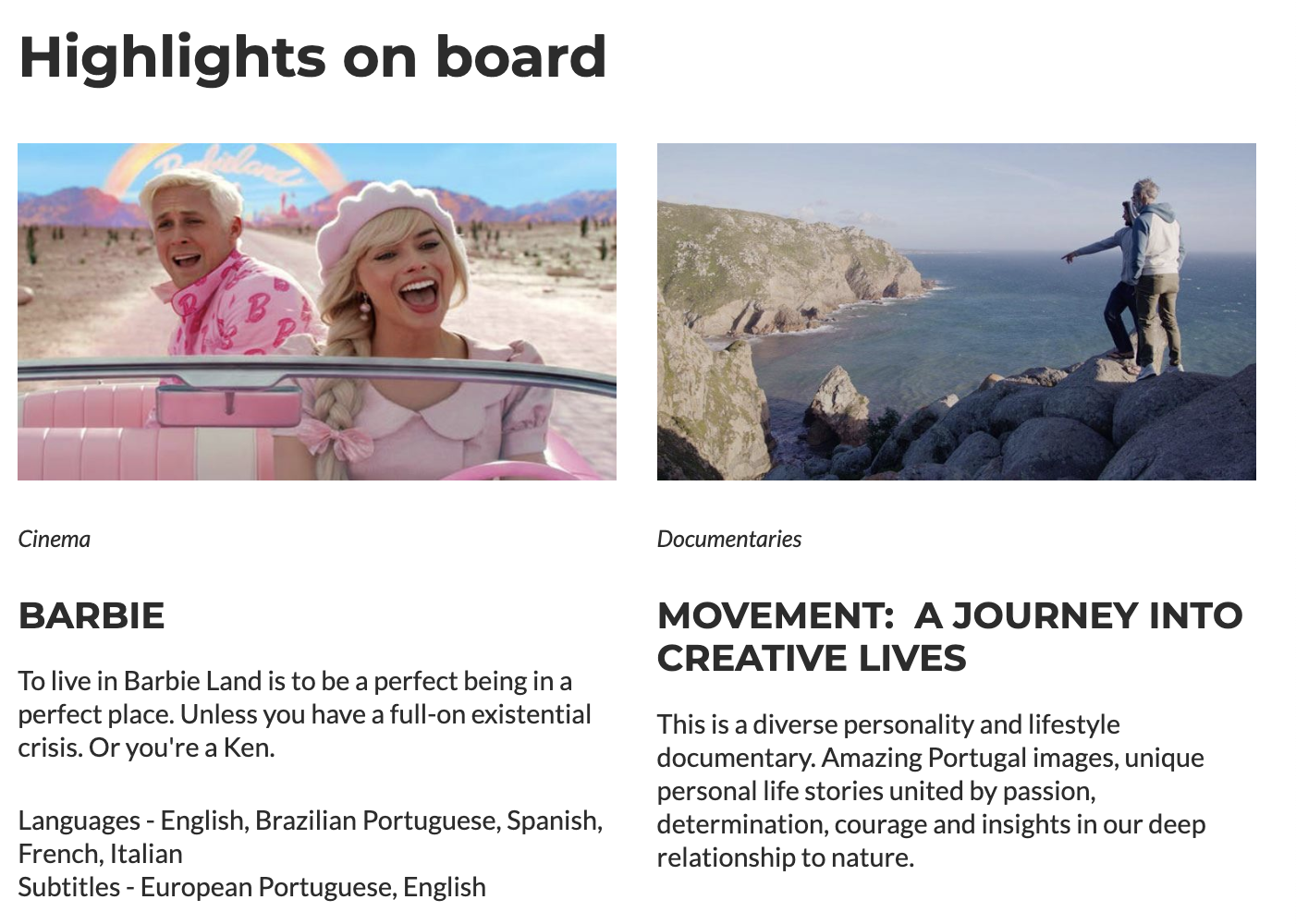 TAP 포르투갈 항공은 기내 엔터테이먼트 콘텐츠를 즐기실 수 있습니다. 영화, TV채널, 음악 그리고 아동 승객을 위한 유아채널을 보유하고 있으며 아래 링크로 들어가시면 리스트를 미리 확인하실수 있습니다.